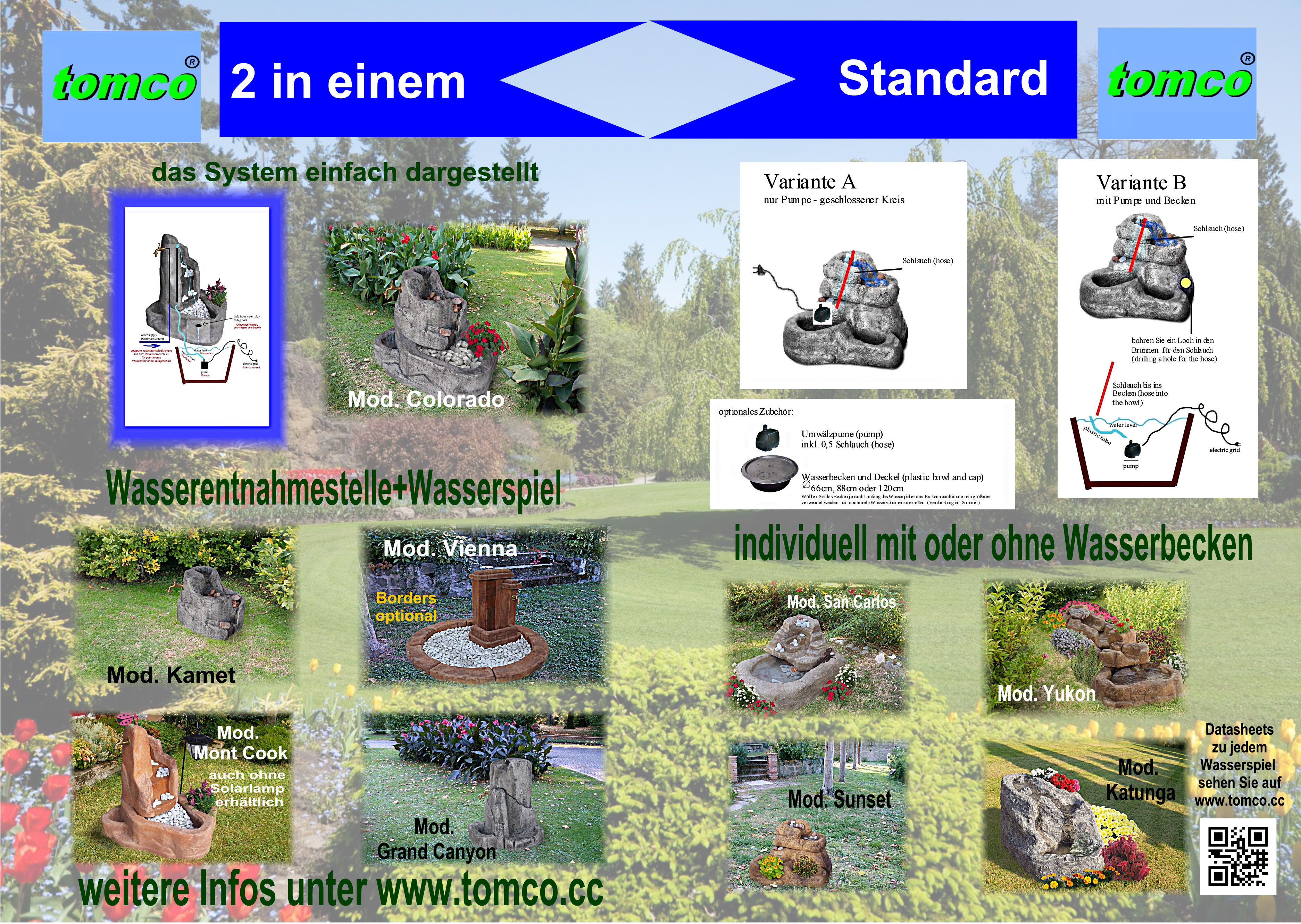 Wasserspiele2 in 1 sind immer komplett mit Kunststoffbecken und Deckel sowie Umwälzpumpe. Maße der Becken: 120cm Durchmesser- Deckel Außenmaß 120cm, Becken Randmass 112cm Innen 110cm Boden 100cm Tiefe 33cm 90/88cm Durchmesser-Deckel Außenmaß 90cm,Becken Randmaß 85cm Innen 80cm Boden 76cm Tiefe 33cm 66cm Durchmesser Deckel Außenmaß 66cm,Becken Randmaß 64cm Innen 60cm Boden 52cm Tiefe 33cm Umwälzpumpe Leistung 1000l/h 14 Watt inkl. 0,5m Schlauch Bei Bedarf : Umwälzpumpe Leistung 1500 l/h 20 Watt inkl. 0,5m Schlauch | |||||||||||||||||||||||||||||||||||||||||||||||||||||||||||||||||||||||||||||||||||||||||||||||||||||